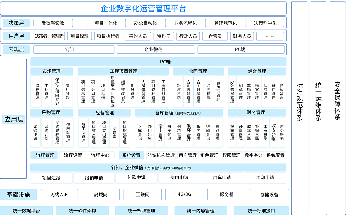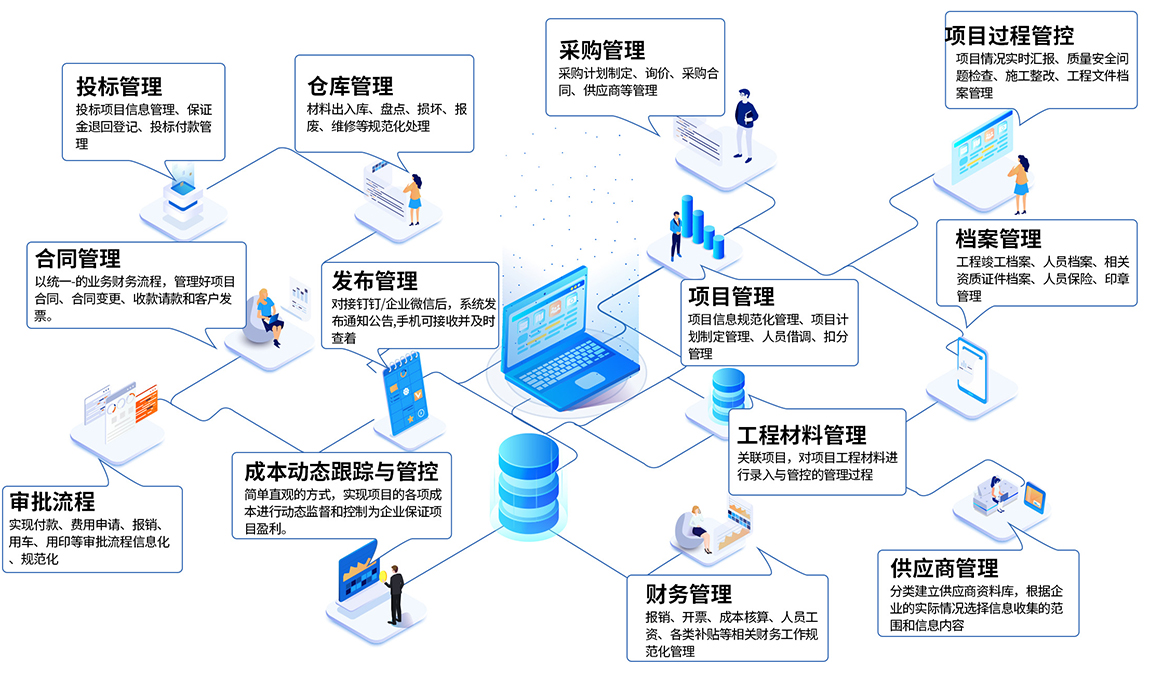 數(shù)字化管理系統(tǒng)對(duì)企業(yè)工程項(xiàng)目從項(xiàng)目投標(biāo)中標(biāo)、項(xiàng)目過(guò)程管理、合同管理、物資設(shè)備管理、采購(gòu)管理、項(xiàng)目過(guò)程管理、施工隊(duì)管理、供應(yīng)商、成本核算等進(jìn)行全面綜合管理;縱向貫穿投標(biāo)、采購(gòu)、施工、竣工的全過(guò)程,橫向涉及公司內(nèi)部的各相關(guān)崗位,是一套全方位、集成的企業(yè)項(xiàng)目綜合管理平臺(tái)。通過(guò)對(duì)成本、進(jìn)度、質(zhì)量、安全等方面的控制,以及對(duì)合同、結(jié)算、支付、資金等要素的管理,來(lái)提高工程類企業(yè)對(duì)工程項(xiàng)目的綜合配套能力。